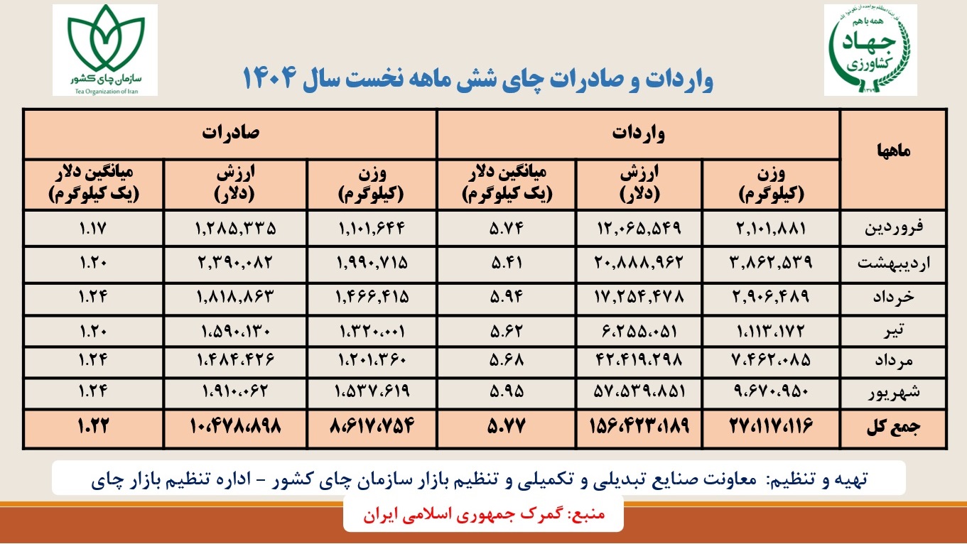 آمار واردات و صادرات چای شش ماهه نخست سال 1404 و مقایسه آن با سال 1403 و 1402