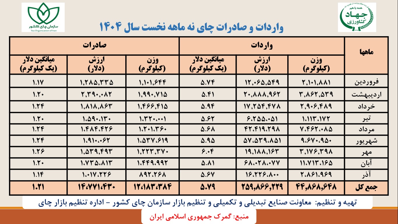 واردات و صادرات چای نه ماهه نخست سال 1404